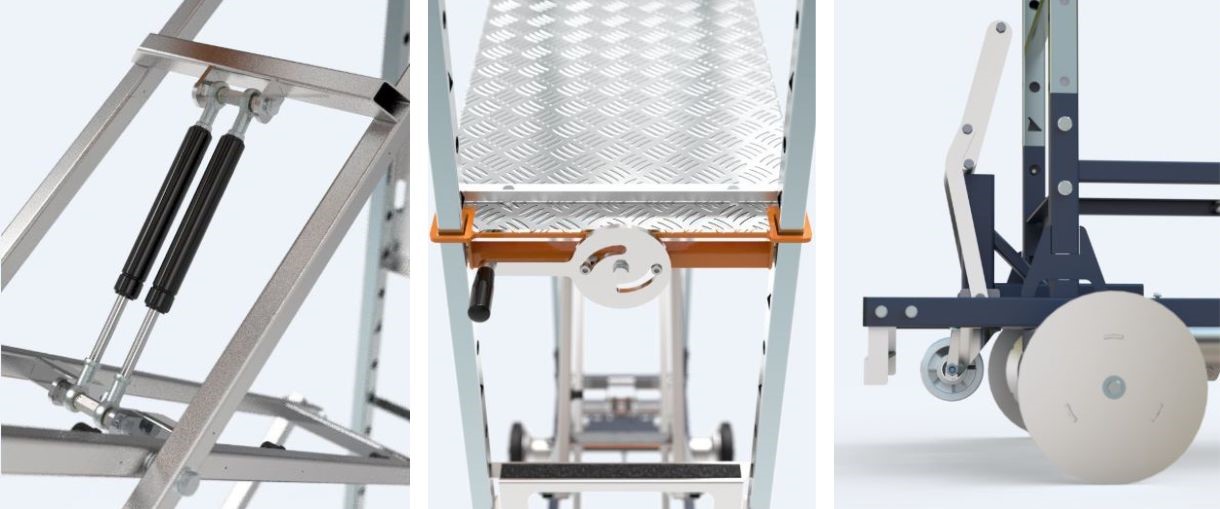 - Safe working at height: Stable trolley with safety railing and adjustable platform