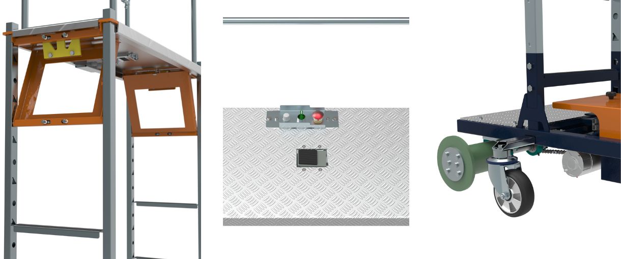 De buisrailwagen biedt een royale werkplek welke via een uitgekiend kliksysteem op elke gewenste hoogte vastgezet kan worden. Afhankelijk van de gekozen hoogte van het platform worden er meer of minder traptreden in geklikt.