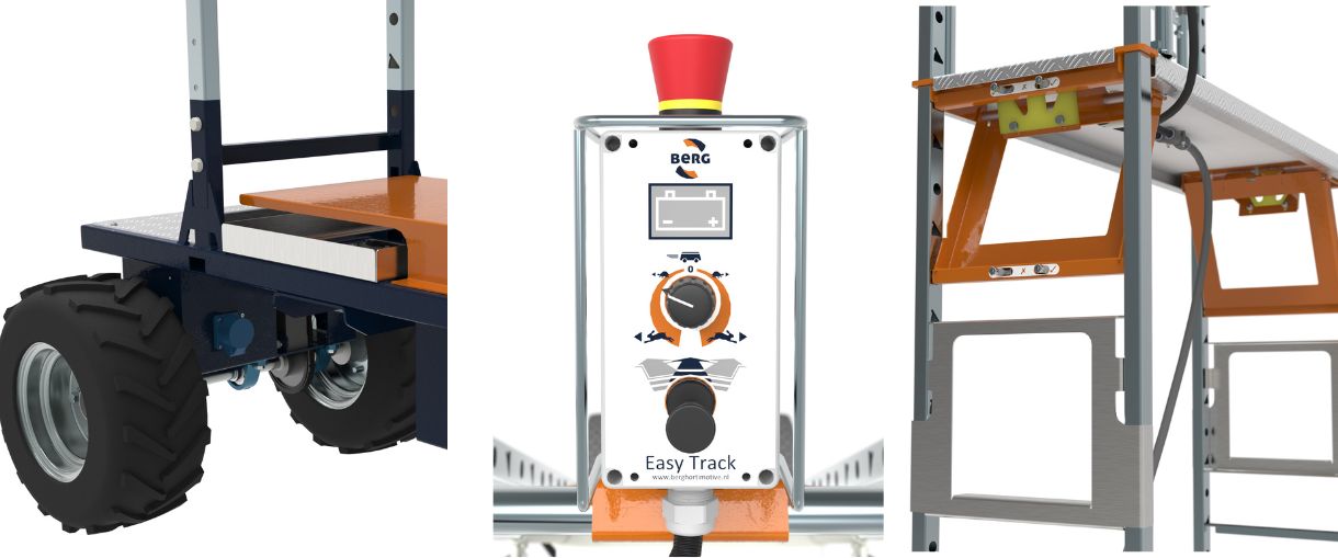 Ook op tuinbouwbedrijven zonder buisrailsysteem is er behoefte aan elektrisch aangedreven gewaswagens. Hiervoor heeft Berg Hortimotive de succesvolle BeNomic EasyTrack aangepast. De flensrollen zijn vervangen voor stabiele luchtbanden en de wagen is bestuurbaar gemaakt.